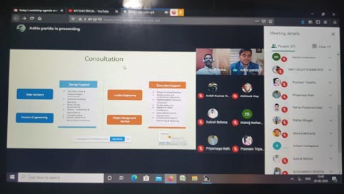 The panel discussion on “Circulating Economy in Green Energy Sector and he Future Ahead” was organized on 29th August 2020 from 10.30am to 11.30am in Google Meet platform The Founder and CEO of Greenomics World of Grinity Intellect Pvt. Ltd. Mr. Ahis Parida was the invited speaker. He spoke about three aspects of Wind Energy, Solar Photo Voltaic Energy and Recycling of Solar Photo Voltaic Systems. He reiterated about creating start up ventures from new thoughts. Prof. Ankit Soni who was the co-host asked one question after the deliberations. Ms. Bibhuti Sharma, Mr. Rishav Bhagat and Mr. Mrityunjay Roy asked one question each. All the questions were answered very well by the speaker. Dr. MK Maharana, Dr. BK Nayak, Prof. Subrat Behera, Madam Kritika Kaul, Madam AAO Mrs. Susree Subitita were among the prominent participants. Lastly, Dr. Srikanta Mohapatra proposed the vote of thanks on behalf of the Honorable Founder, Dr. Achyuta Samanta, Driector-SOEE, Dr. CK Panigrahi, the CR & IE members and the participants. The host Dr. Srikanta Mohapatra signed off along with Prof. Ankit Soni. Two photographs are attached for corroboration.