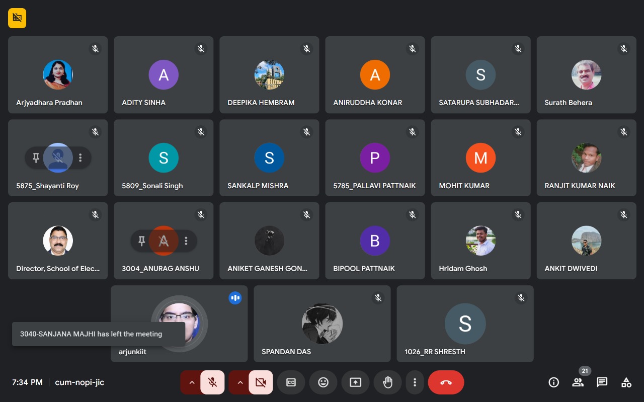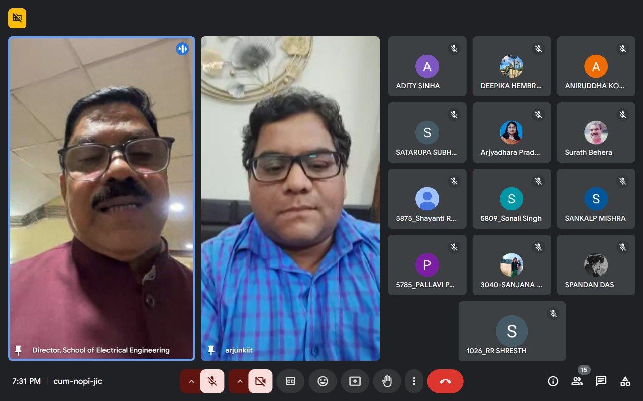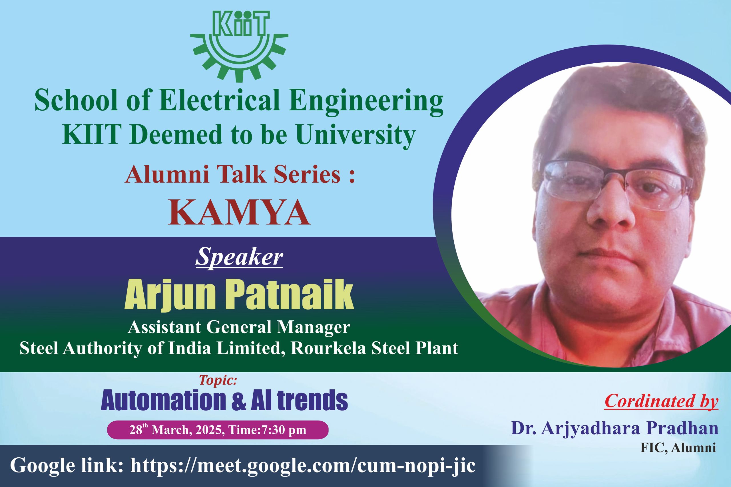 School of Electrical Engineering conducted KAMYA: ALUMNI TALK SERIES on 28th March,2024 on the topic “Automation & AI trends” at 7:30 pm in virtual mode. The session started with the welcome address by Dr. Arjyadhara Pradhan, FIC Alumni, School of Electrical Engineering. The speaker of the session Mr. Arjun Patnaik, is currently working as Assistant General Manager,Steel Authority of India Limited, Rourkela Steel Plant. He has completed his B.Tech in 2009. Mr Patnaik shared his experience and journey from B.tech to steel plant. He emphasized on the strengthening the core knowledge. He also mentioned that nowadays all the works in the industry are automated and how AI is used in the system process. Mr Patnaik interacted with the students and answered to all their queries. He also discussed about the recent technology he is working with. The discussion was like a bridge between the university and industry. More than 50 participants and many faculty members joined the session. The session was full of participatory discussion among the students and the speaker.