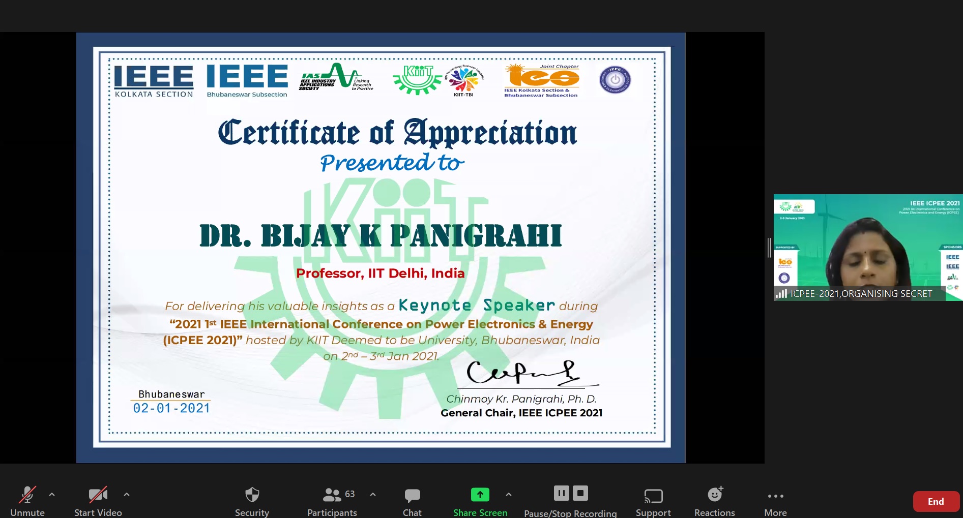 Valedictory function was graced by Dr. K. R. Suresh Nair, Chair, IEEE India Council; Dr. Venugopal Shankar, Vice President, Mahindra; Prof. Srinibash Karanki, Publication Chair (IIT Bhubaneswar); Prof.  Sarat Chandra Swain, Chair,  Local Organizing Committee, ICPEE-2021 (KIIT); Prof. Tanmoy Roy Choudhury, Chair, Publicity Committee (KIIT); Dr. Subhra Devdas, Chair, Publicity Committee, (KIIT); Dr. Rudra Narayan Dash, Chair, Finance  Committee (KIIT); Dr. Kundan Kumar, Organizing Secretary (NIT Manipur); Prof. Jnyana Ranjan Mohanty, Registrar, KIIT; Prof. Subhranshu Ranjan Samataray, Secretary, IEEE Bhubaneswar Sub-section (IIT Bhubaneswar); Prof. Celia Shahnaz, Chair, IEEE Bangladesh Section (Professor, BUET); Prof. Sudarshan Nanda, Research Chair, KIIT; and Prof. Chinmoy Kumar Panigrahi, General Chair, ICPEE-2021 (Professor, SoEE, KIIT). Award for best paper in Technical Track and one best paper throughout the Conference were given away on the occasion. Word of thanks was proposed by Dr. Chitralekha Jena, Organizing Secretary, (KIIT).
